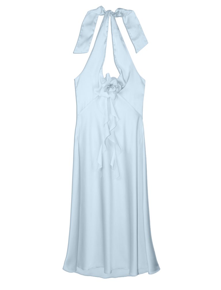 Midi loose-fit halter dress in a silk satin fabric in a light blue color. Detailed with an extra-long flower trim at the front. Finished with shoulder ties at the neck.