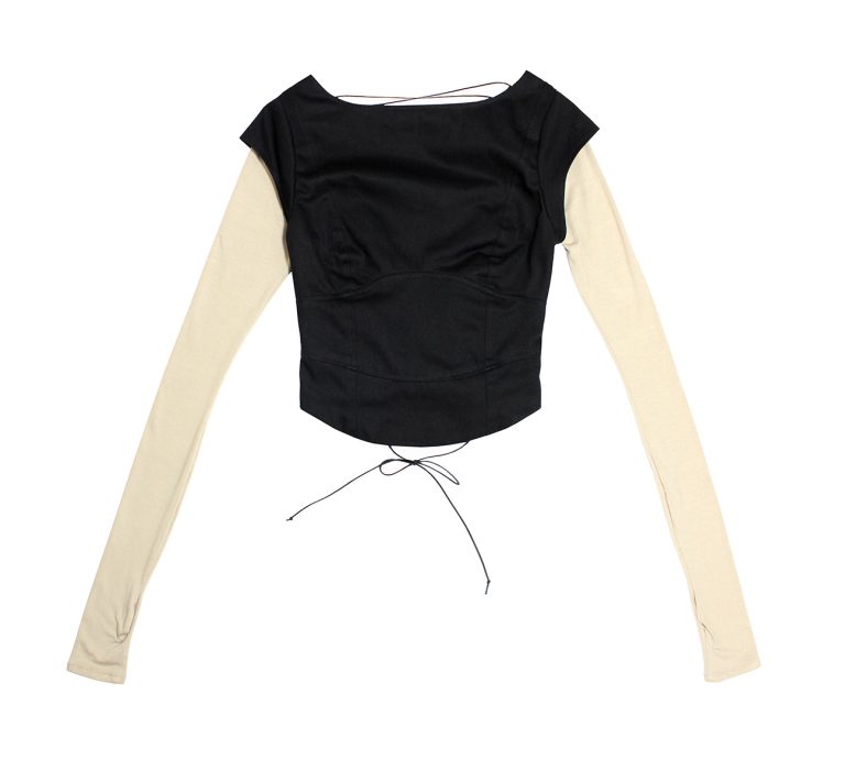 Top ajustable, en tela de gabardina color negro. Detallado con mangas largas removibles en brush en color arena. Acabado con un zipper metálico en el costado.