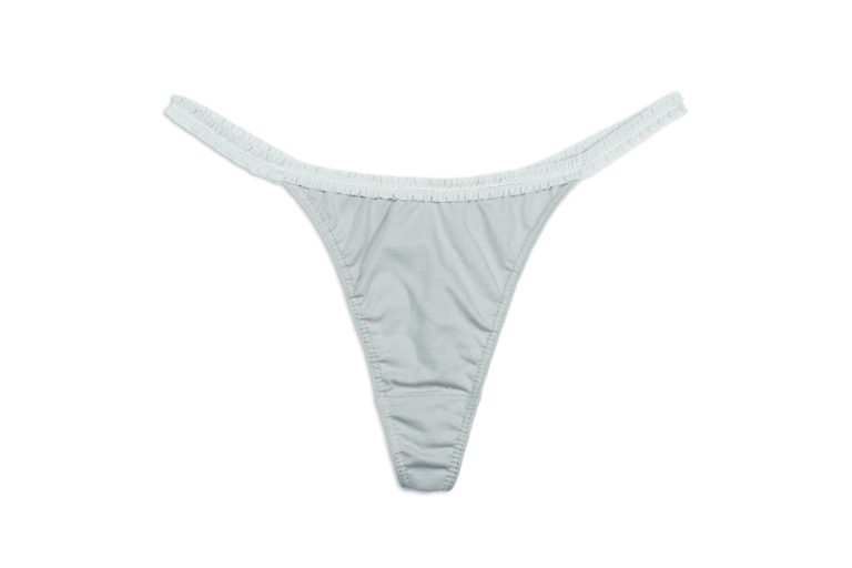 V-string thong in a soft stretch jersey fabric in sage green. Finished with a ruffled elastic around the waist.