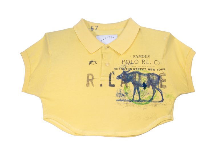 Booty shorts and short-sleeve polo made from an upcycled shirt in yellow. Detailed with shoulder pads. Finished with an elasticated waistband.