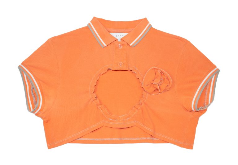 Short-sleeve polo made from an upcycled shirt in orange. Detailed with an adjustable hole on the chest and a rose at the front. Finished with a matching bralette top.