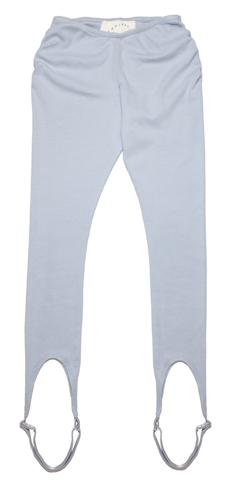 Fitted, low-waist stirrup leggings in a light blue jersey fabric. Detailed with ruching at the hips. Finished with an elastic waistband and adjustable elastic straps at the hem.