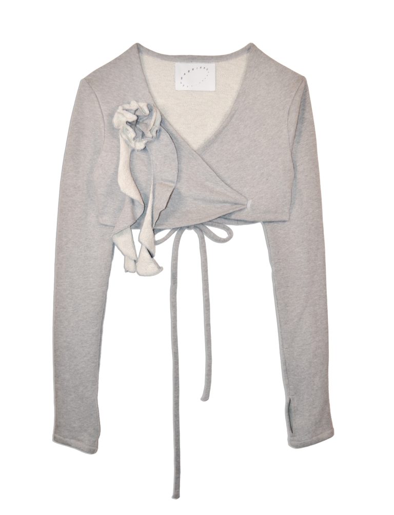 Cropped jacket in a light grey terry fabric. Detailed with ruching at the front, long sleeves and thumbhole openings. Finished with crossed ties for closure and a rose appliqué with hanging lengths.