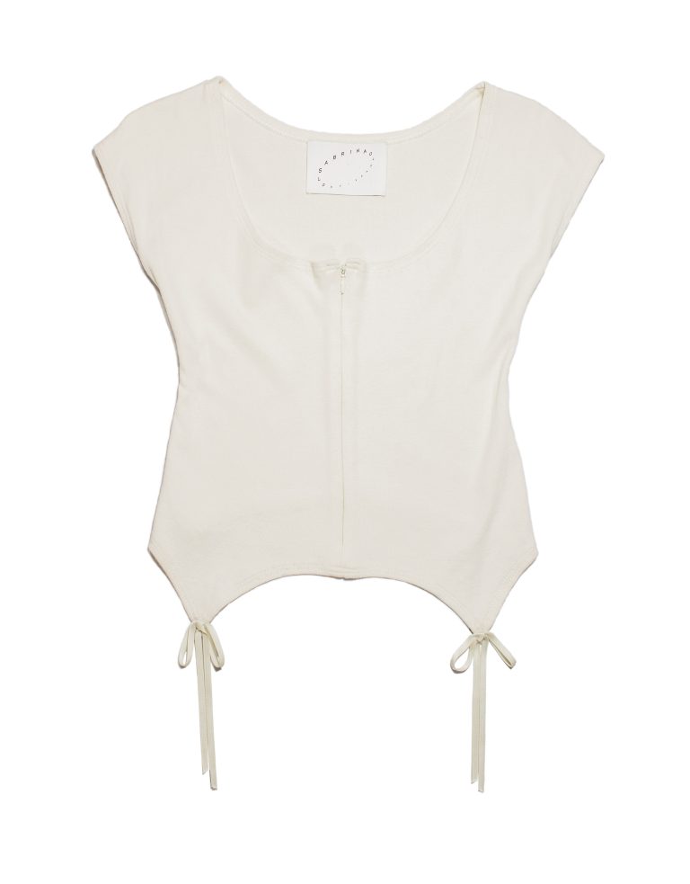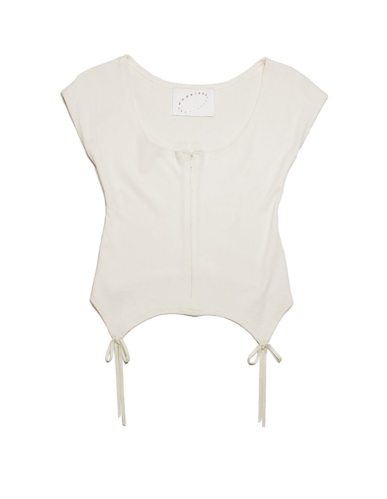 Fitted short sleeve top in an ivory jersey fabric. Detailed with a curved hem and two decorative bows at the front. Finished with an invisible zipper at the center front for closure.